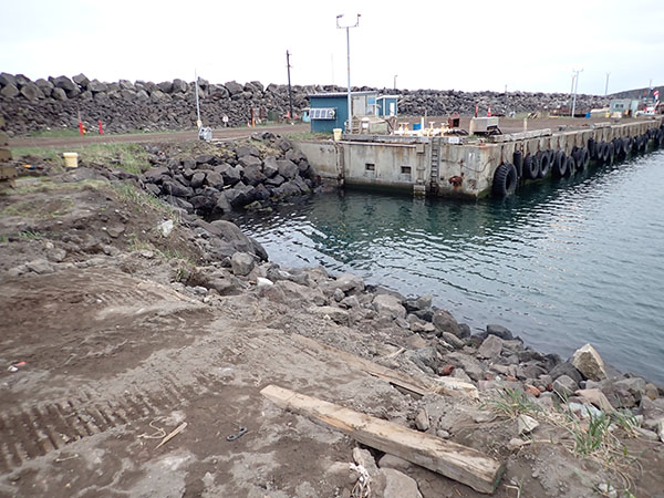The City South Dock has an inadequate tire fender system, inadequate cleats, broken or missing bull rails, and damaged or missing ladders. Users report that the wave climate in the harbor is routinely very bad, and mooring lines regularly snap while at berth. The timber bull rails are severely deteriorated or missing altogether. The current fenders are used truck tires scavenged from the city dump that have been chained to the outside of the dock. All access ladders are smashed flat from vessel impacts. Mooring cleats are insufficient in number and spacing for mooring. Some of the cleats have been torn from the dock or bent. The cleats are also improperly sized and located for either fishing vessels or larger vessels. The smaller vessels’ lines tend to pull horizontally and need cleats closer together, while the larger vessels pull from a steeper angle and need cleats spaced further apart. Also missing on the south dock are mooring bollards to hold vessels, especially larger ones, in rough weather. Wave surges in the harbor basin combined with strong winds often result in vessels being slammed against mooring infrastructure. During winter, ice sometimes forms or washes inside the harbor. It is common for the ice to become wedged between a vessel and the dock. The presence of the ice and inadequate fenders preclude the vessel from being able to moor tightly against the dock. The result is that the vessel slams against the dock when driven by winds and wave surges. The deteriorated state of the City South Dock increases the risk of damage to vessels using the facility and increases the risk of injury to crew-members onboard vessels or on the dock.